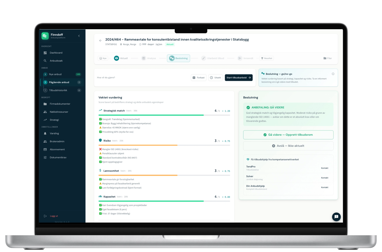 Finndoff følger deg gjennom hele anbudsprosessen — fra varsling og kvalifisering til ferdig tilbud. Med eksperter, AI og bransjenettverk i ryggen. Du velger modulene du trenger, og betaler bare for det du bruker.